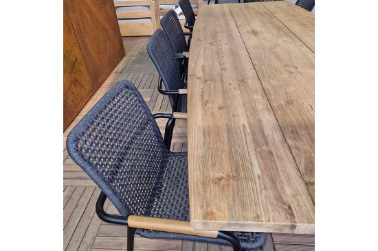 Table familiale en teck de 300 cm avec pieds en acier, dotée d'un plateau robuste en teck recyclé d'une épaisseur de 4 cm. Les bords des grandes longueurs présentent une légère courbure et un biseau, conférant à cette table une imposante et originale allure, qui ne manquera pas d'attirer le regard et l'admiration.